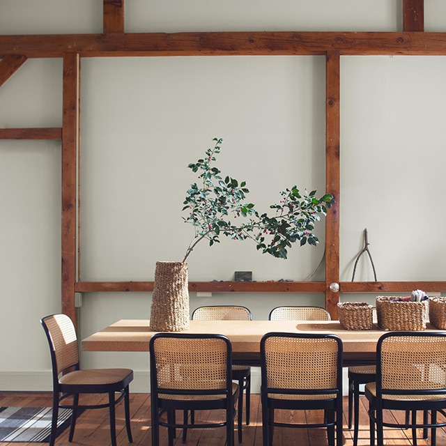 A. The colour you choose for your dining room is entirely up to you. Whether you want to go for drama with a bold, dark hue or keep things light with an off-white paint colour or a neutral, Benjamin Moore has 3,500+ dining room paint colour options that will help you create a dining room that fits your personal style.